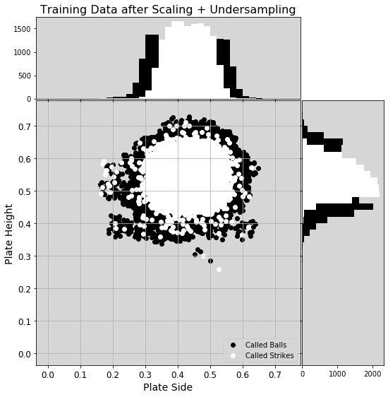 Just to better understand the false positives and false negatives, I looked only at their data. Interestingly, there are more missed predictions on one side of the plate (the mean would be zero if equally distributed laterally). The training data was asymmetric before scaling and undersampling (see figure), but those steps seemed to correct the lateral asymmetry. Still there remained a population of called strikes on the left side of the plot (I’m assuming outside to a right-handed batter, though I wasn’t told how the pitch location numbers mapped to real space), and their presence in the training data contributed to the missed calls outside.